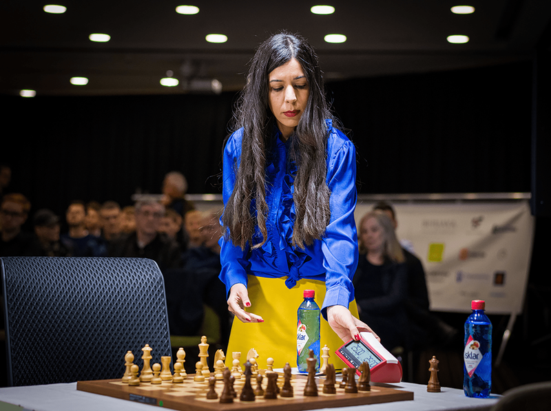Bayat During Round 2, pushing her hijab back further to make a point (Photo: Zhang Yanhong, FIDE)