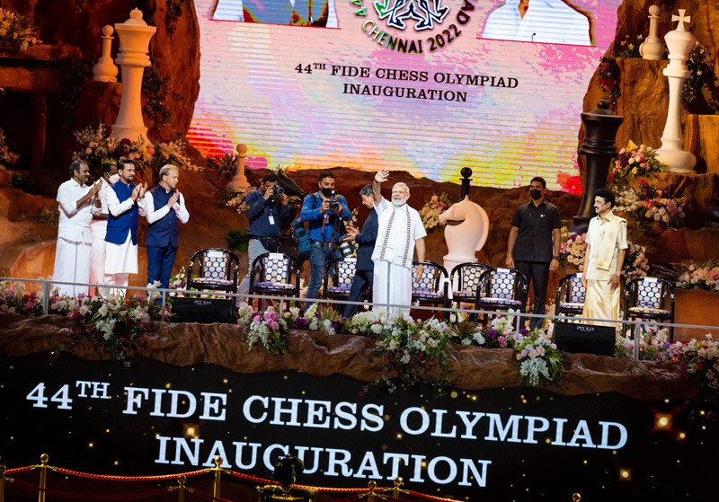 Narendra Modi addresses the Olympiad crowd while Dvorkovich applauds on the left. Also in attendance Tamil Nadu Chief Minister MK Stalin and Sports Minister Anurag Thakur. (Photo: Lennart Ootes)