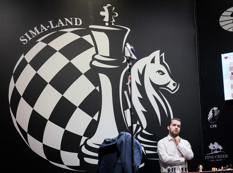(Lennart Ootes for FIDE - Nepomniachtchi thinking near Sima-Land's logo)