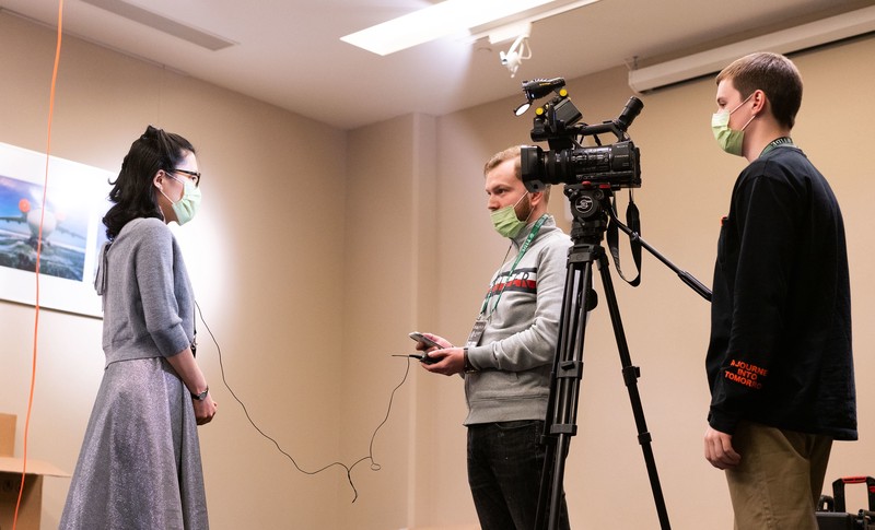 (Lennart Ootes for FIDE - Hou Yifan going through sound and video checks before being interviewed by Russian TV)