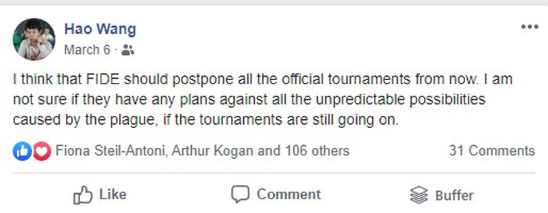 Wang Hao also publicly shared concerns about the safety of the tournament, posting on social media.