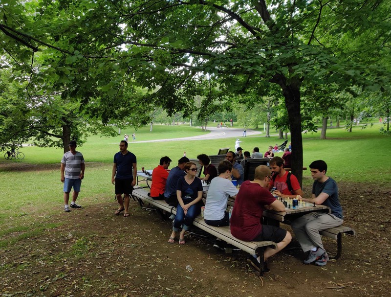 Chess fun in the sun (and rain)This past Saturday, Lichess held its second Montréal meetup in the beautiful Mount Royal Park. The sun was shining and the chess fans were out in force, playing some casual blitz, rapid and even bughouse, as well as a 3+2 tournament organised by @Toscani (who also kindly provided most of the boards and clocks). Over the course of the afternoon, around 60 people stopped by, until eventually the forecast rain drove us inside towards the end of the schedule.