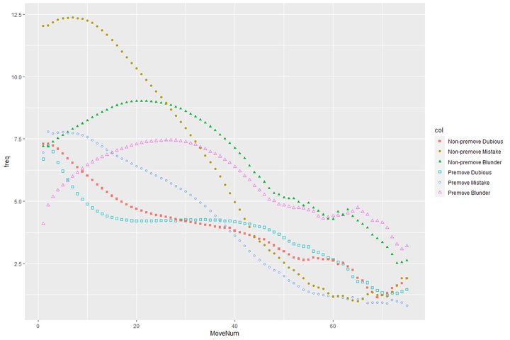 If you visualize this by move numbers, you get what you expect. Most of the pre-moves are made earlier in the game. The following graph is the distribution of pre-moves by move number (meaning the bars all add up to 1).