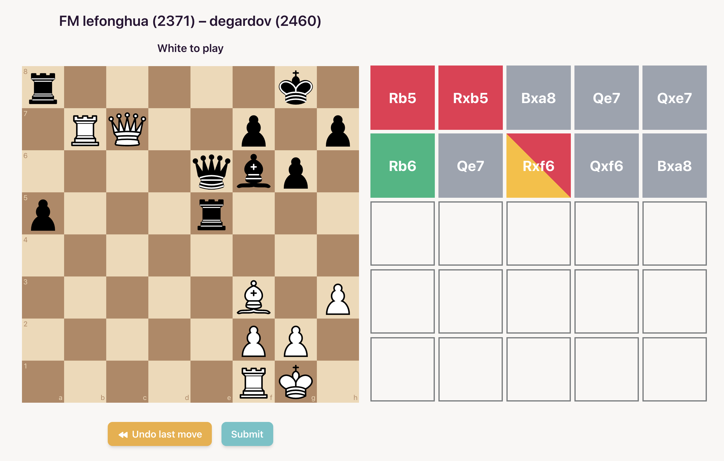 I've now added a third, red color that indicates that the correct piece type was moved, but not necessarily the correct piece. It looks like this: