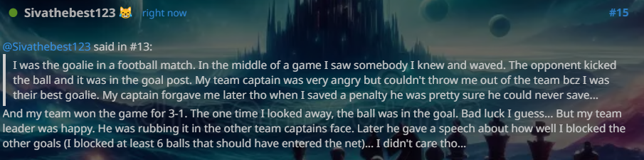 I was the goalie in a football match. In the middle of a game I saw somebody I knew and waved. The opponent kicked the ball and it was in the goal post. My team captain was very angry but couldn't throw me out of the team bcz I was their best goalie. My captain forgave me later tho when I saved a penalty he was pretty sure he could never save...