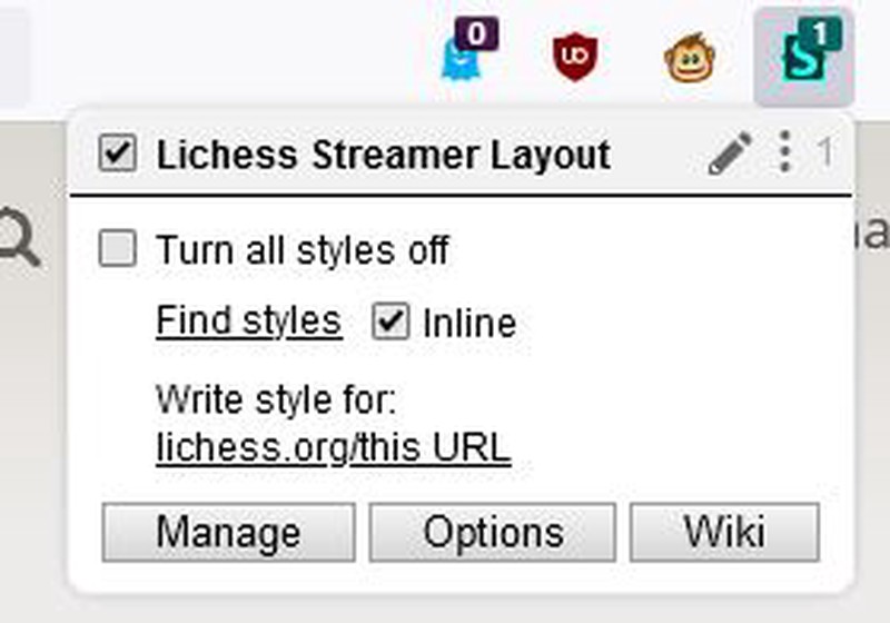 There are many browser extensions that allow you to quickly and easily add and remove user styles. The user style manager we recommend is called Stylus. Lets try installing the Lichess Streamer Userstyle.